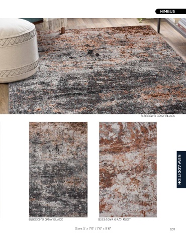 NIMBUS NIMBUS 81831BLM BLUE CREAM 81832GBU GRAY BLUE 81833GYB GRAY BLACK 81831BLM BLUE CREAM 81833GYB GRAY BLACK 81834GYR GRAY RUST NEW ADDITION 119 Sizes 5' x 7'6" | 7'6" x 9'6" Sizes 5' x 7'6" | 7'6" x 9'6" 120