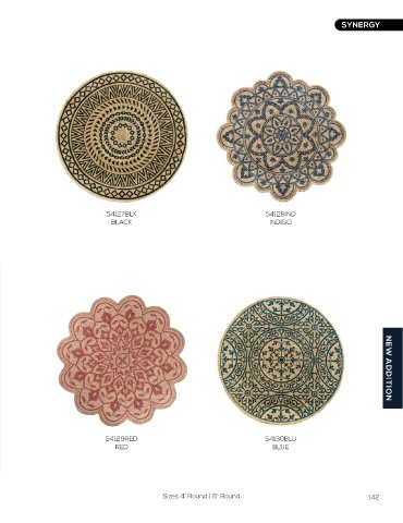 SYNERGY SYNERGY 54125RED 54126GRY 54127BLK 54128IND RED GRAY BLACK INDIGO 54129RED 54130BLU NEW ADDITION RED BLUE 54125RED RED 141 Sizes 4' Round | 6' Round Sizes 4' Round | 6' Round 142