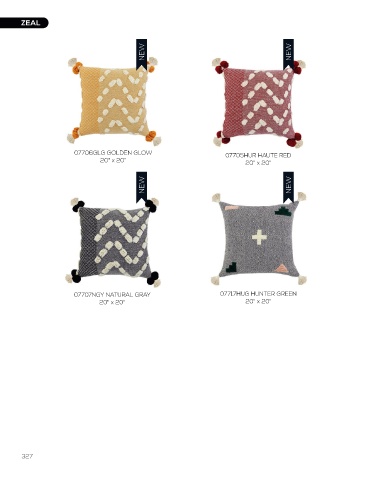 ZEAL ZEAL NEW NEW 07706GLG GOLDEN GLOW 07705HUR HAUTE RED 20" x 20” 20" x 20" NEW NEW 07707NGY NATURAL GRAY 07717HUG HUNTER GREEN 20" x 20" 20" x 20" 07717HUG HUNTER GREEN 327 328