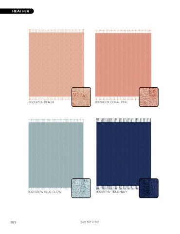 HEATHER HEATHER 80213PCH PEACH 80214CPK CORAL PINK 80261ABL ANGEL BLUE 80263ALO ALLOY 80215BGW BLUE GLOW 80218TNV TRUE NAVY 80264JEB JET BLACK 383 Size 50" x 60" Size 50" x 60" 384