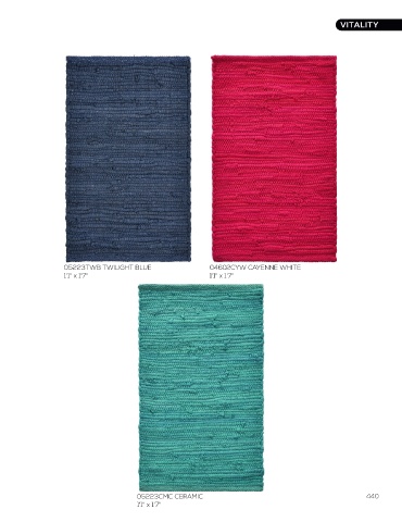 VITALITY VITALITY 18019MCH MICRO CHIP 12027NAT NATURAL 05223TWB TWILIGHT BLUE 04602CYW CAYENNE WHITE 1'1" x 1'7" 1'3" Round 1'1" x 1'7" 1'1" x 1'7" 18019MCH MICRO CHIP 1'4" x 6'8" 32018NAT NATURAL 1'4" x 6'8" 439 05223CMC CERAMIC 440 1'1" x 1'7"
