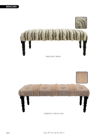 BENCHES BENCHES 99011CRM CREAM 99013NTG NATURAL GOLD 99012MCH MICRO CHIP 99018WHT WHITE 459 Size 47" W x 16" D x 18" H Size 47" W x 16" D x 18" H 460