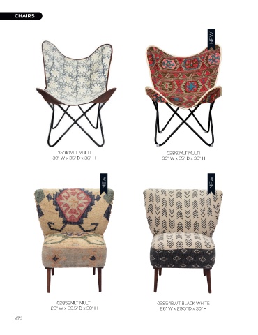 CHAIRS CHAIRS NEW 35010MLT MULTI 02891MLT MULTI 30" W x 35" D x 36" H 30" W x 35" D x 36" H NEW NEW 02852MLT MULTI 02854BWT BLACK WHITE 02852MLT MULTI 26" W x 29.5" D x 30" H 26" W x 29.5" D x 30" H 473 474