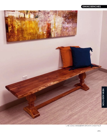 DINING BENCHES DINING BENCHES NEW 02896BRW BROWN 75" W x 16" D x 18" H LIVE EDGE 99081BNR BROWN CHESTNUT 72" W x 16" D x 18" H NEW ADDITION LIVE EDGE 99082NAT BROWN CHESTNUT 72" W x 16" D x 18" H LIVE EDGE 99081BNR BROWN CHESTNUT 475 476