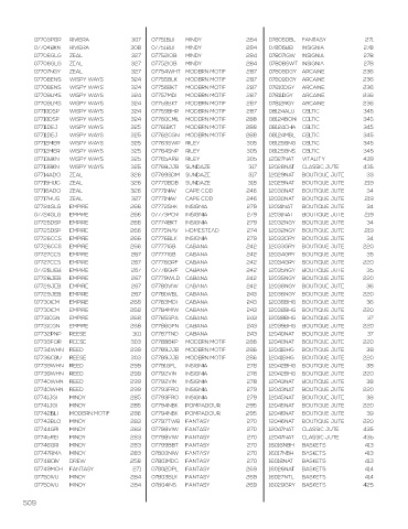 07703PGR   RIVIERA           307    07751BLI  MINDY             284    07805DBL  FANTASY            271                    16030GRN  BASKETS            425   21706BEI  BELLA ROSE         23    34048BLK  AVANT-GARDE        341