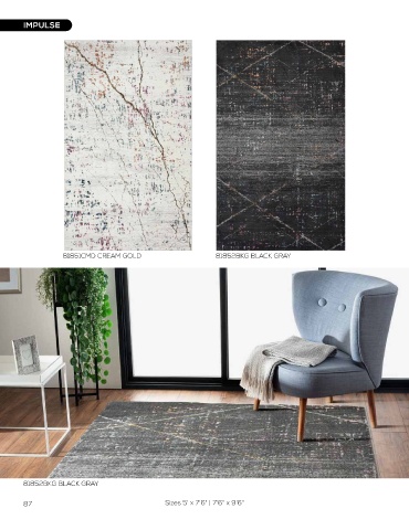 IMPULSE IMPULSE 81851CMD CREAM GOLD 81852BKG BLACK GRAY 81853PBG PLUM BEIGE 81852BKG BLACK GRAY 81853PBG PLUM BEIGE 81854BLE BLUE BEIGE NEW ADDITION 87 Sizes 5' x 7'6" | 7'6" x 9'6" Sizes 5' x 7'6" | 7'6" x 9'6" 88