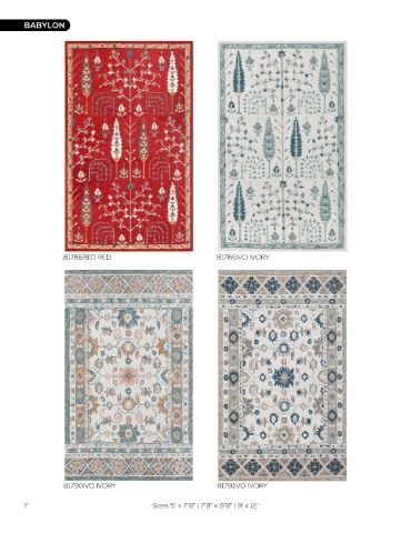 BABYLON BABYLON 81785RED RED 81786IVO IVORY 81787GRY GRAY 81788IVE IVORY BEIGE 81790IVO IVORY 81791IVO IVORY 81789IGY IVORY GRAY 7 Sizes 5' x 7'9" | 7'9" x 9'9" | 9' x 12' Sizes 5' x 7'9" | 7'9" x 9'9" | 9' x 12' 8